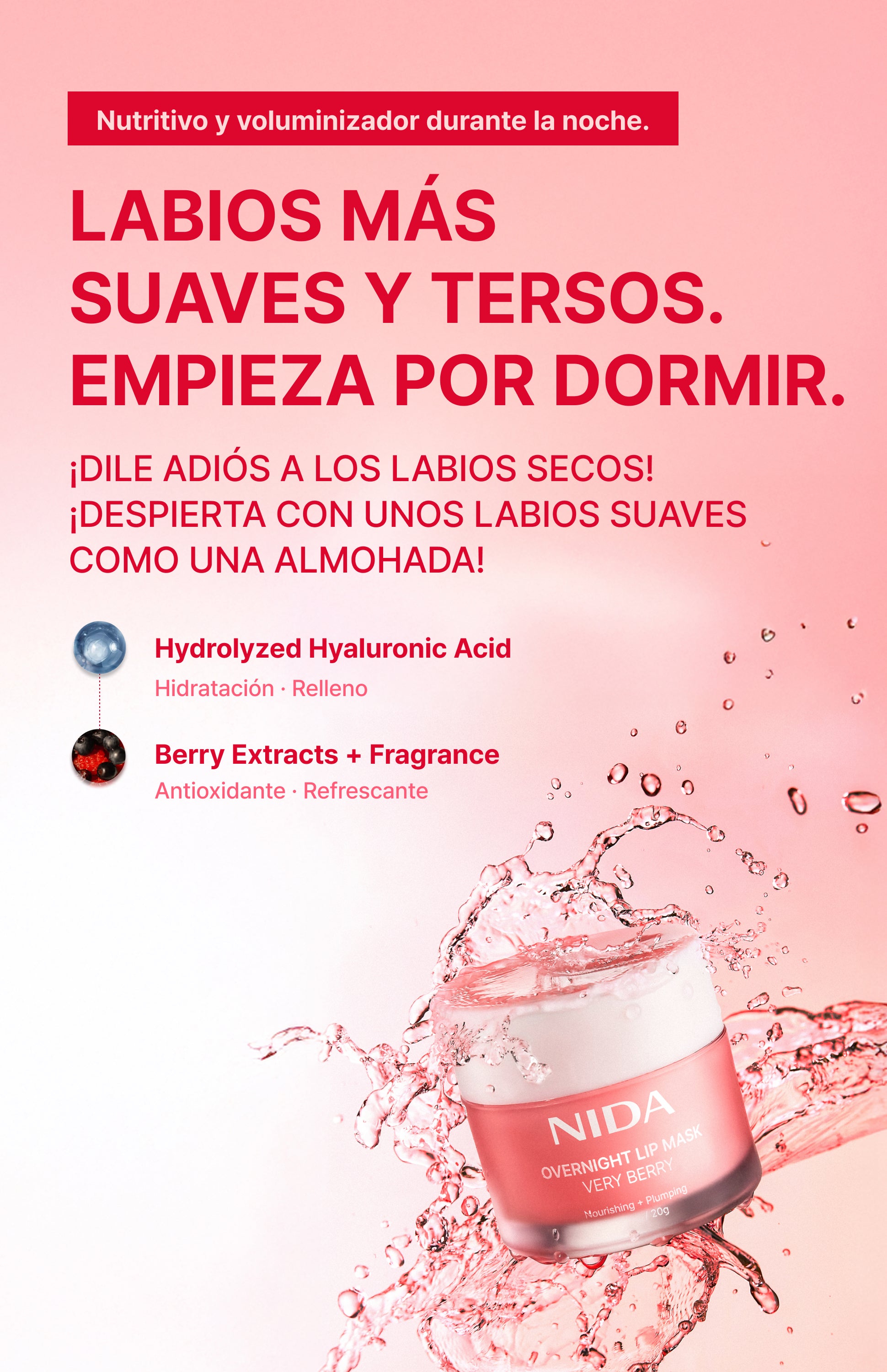 Dale a tus labios el cuidado y la atención que merecen. Con la Mascarilla Labial Nocturna NIDA en color Frutos Rojos, tu ritual nocturno para unos labios irresistiblemente voluminosos, suaves y tersos al tacto. ¡Despierta cada mañana con unos labios que anhelarán! 😘