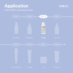 Después de la limpieza, aplique una cantidad adecuada de manera uniforme en el rostro frotando con un disco de algodón y dando golpecitos con las manos.