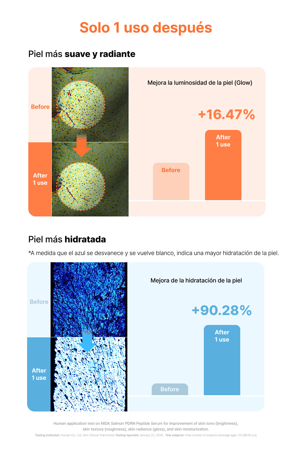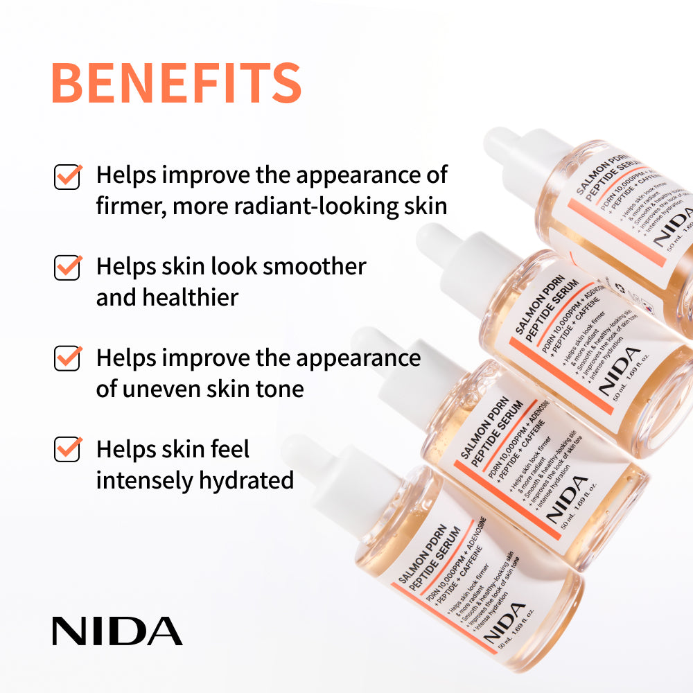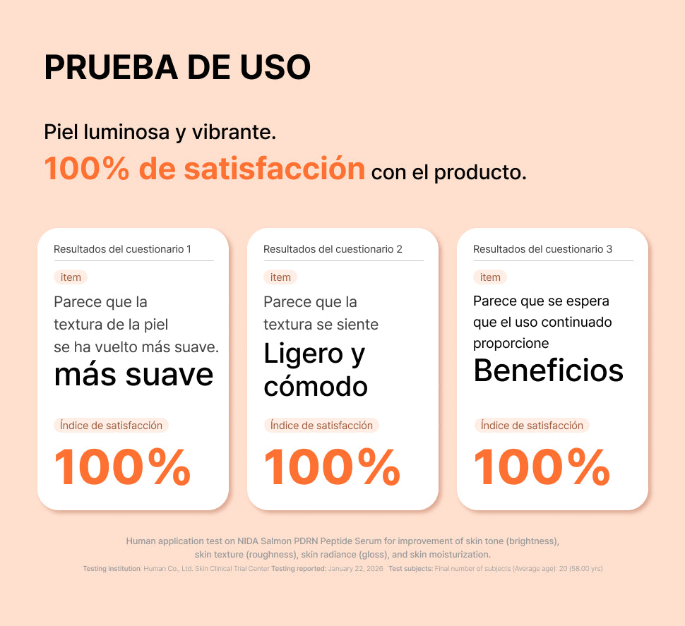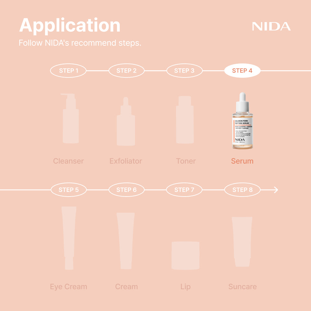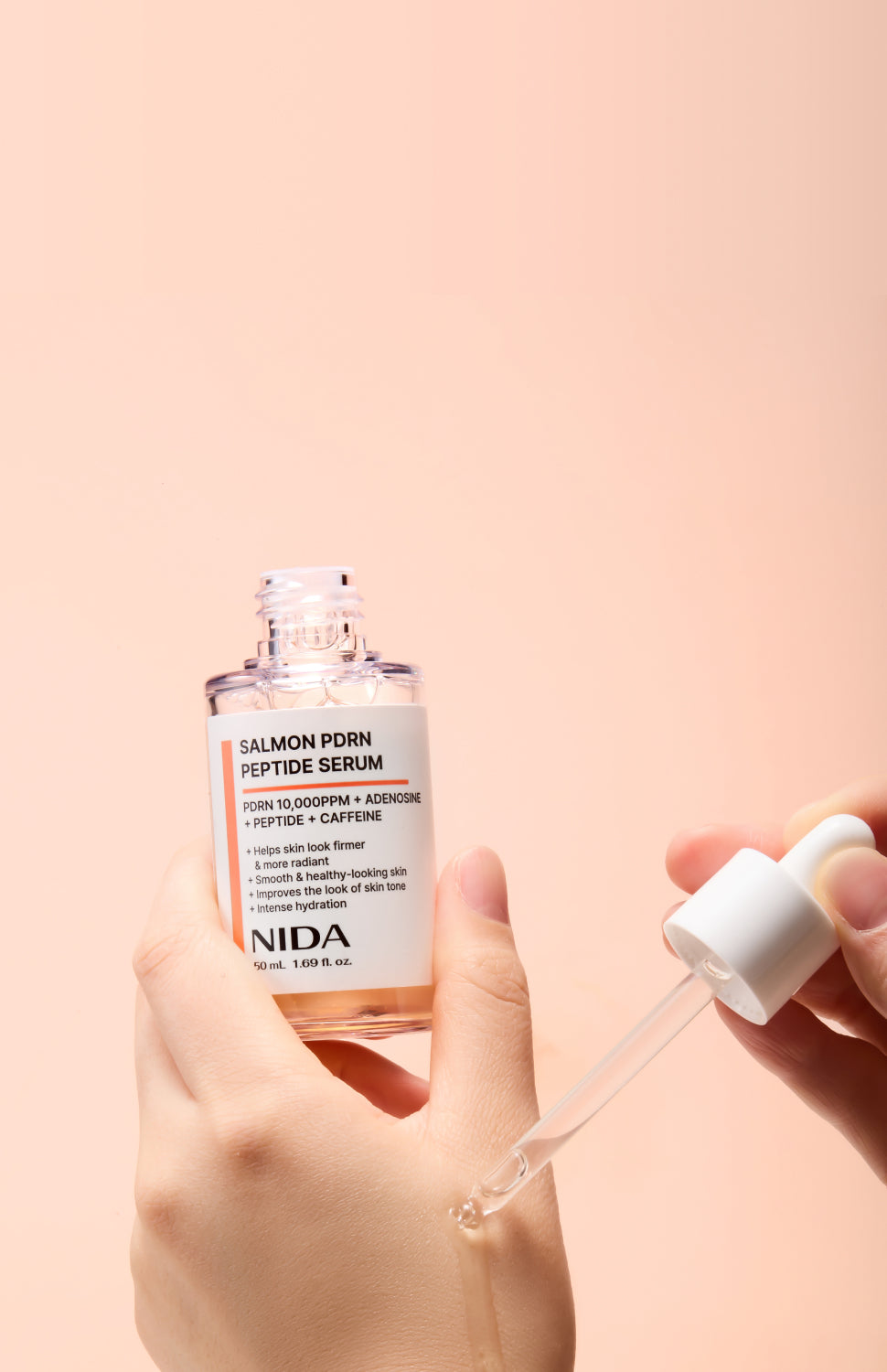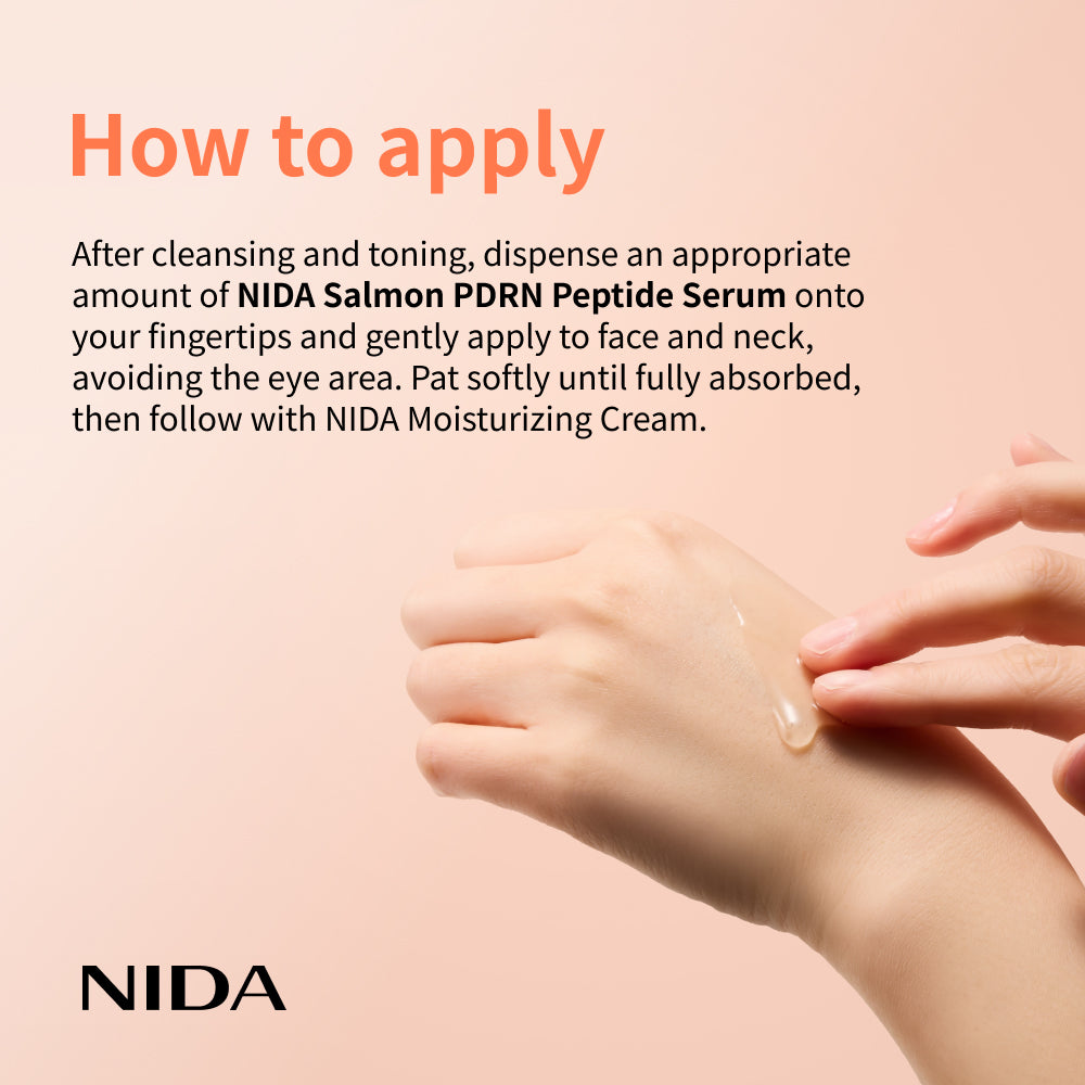 Después de limpiar y tonificar, aplique una cantidad adecuada de NIDA Salmon PDRN Peptide Serum en las yemas de los dedos y aplíquelo suavemente en rostro y cuello, evitando el contorno de ojos. Dé suaves toques hasta su completa absorción y, a continuación, aplique la Crema Hidratante NIDA.